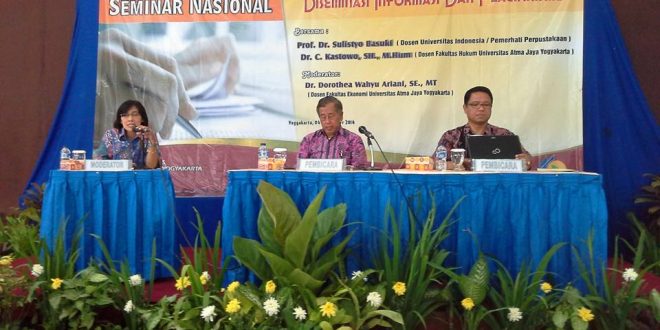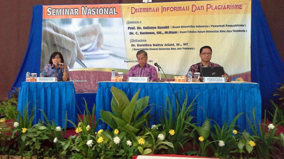 Kamis, 4 September 2014, perwakilan dari Perpustakaan Unpar mendapat kesempatan untuk mengikuti kegiatan seminar yang diadakan oleh Perpustakaan Universitas Atma Jaya Yogyakarta. Seminar tersebut bertajuk “Diseminasi Informasi dan Plagiarisme” yang dimoderatori oleh Dr. Dorothea Wahyu Ariani, SE., MT. (Dosen Fakultas Ekonomi Universitas Atma Jaya Yogyakarta). Sebagai narasumber yaitu Prof. Dr. Sulistyo Basuki (Dosen Universitas Indonesia / Pemerhati Perpustakaan) dan Dr. C. Kastowo, SH., M.Hum (Dosen Fakultas Hukum Universitas Atma Jaya Yogyakarta).